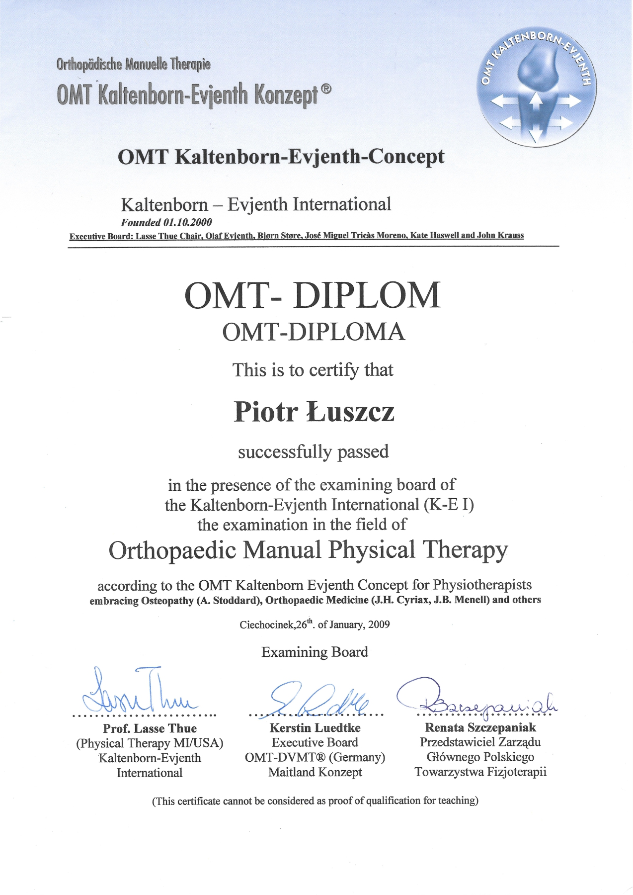 Fizjoterapeuta przedstawiający się jako praktyk OMT musi posiadać zaświadczenie o zdaniu uznanego w świecie egzaminu z OMT.